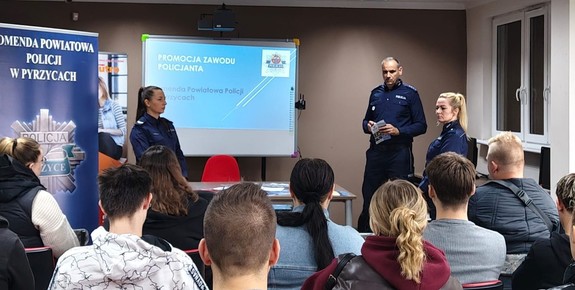 Służba w Policji to nie tylko pasjonująca i pełna wyzwań praca, ale również zaszczyt noszenia munduru oraz poświęcenie na rzecz Ojczyzny i społeczeństwa. W Zespole Szkół nr 1 im. Noblistów Polskich w Pyrzycach odbyło się spotkanie uczniów klas maturalnych z funkcjonariuszami Komendy Powiatowej Policji. Rozmowy dotyczyły służby w policji, bezpieczeństwa i planów na przyszłość. Maturzyści poznali, jak wygląda codzienna służba, etapy rekrutacji do Policji oraz jakie są wymagania, aby zostać policjantem.