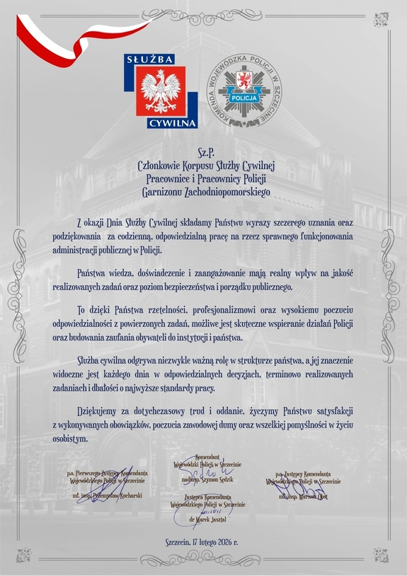 Komendant Wojewódzki Policji w Szczecinie nadinsp. Szymon Sędzik z okazji Dnia Służby Cywilnej składa serdeczne życzenia wszystkim pracownikom Policji garnizonu zachodniopomorskiego.