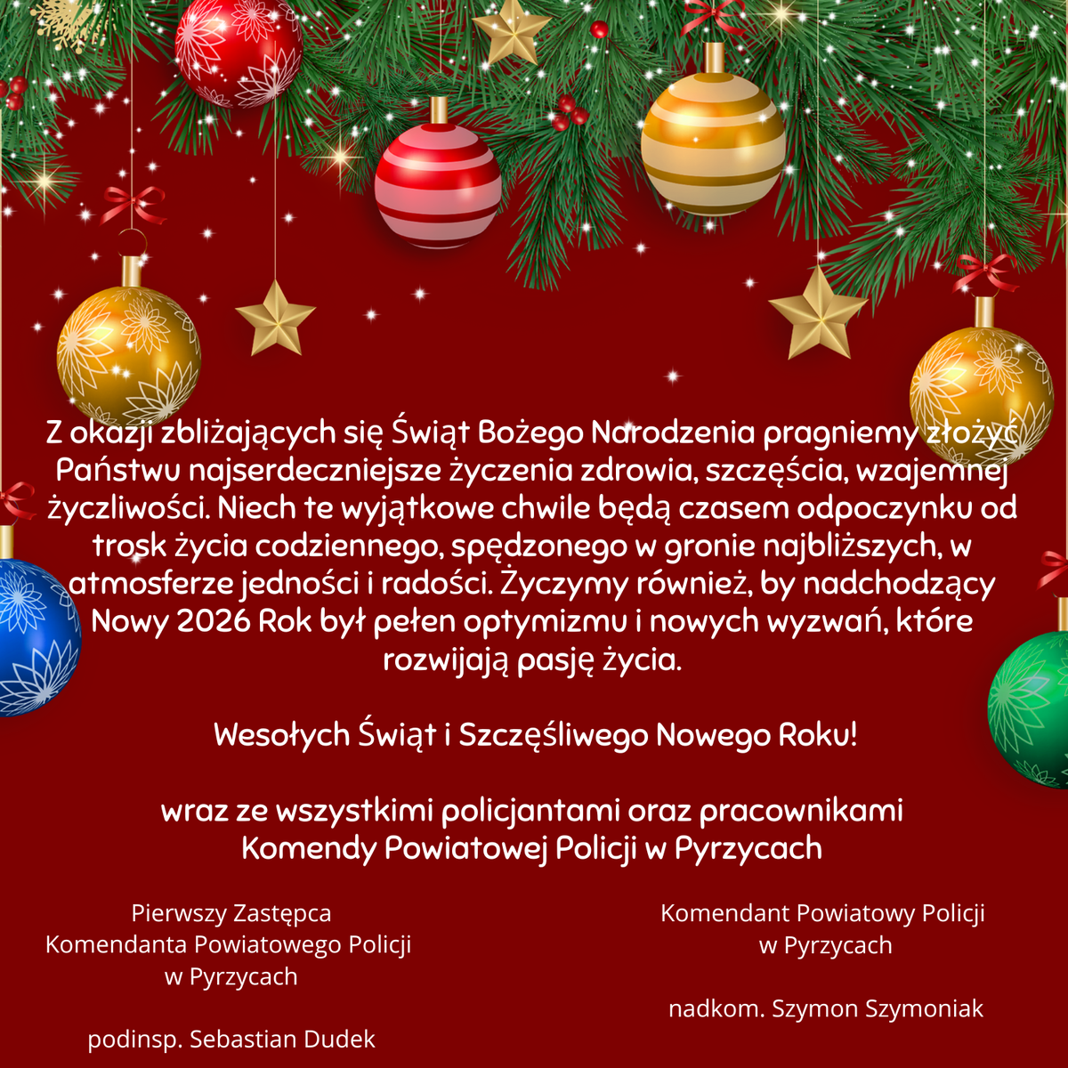 Komendant Powiatowy Policji w Pyrzycach składa wszystkim mieszkańcom powiatu pyrzyckiego serdeczne życzenia spokojnych, rodzinnych i bezpiecznych Świąt Bożego Narodzenia oraz pomyślności w nadchodzącym Nowym Roku.