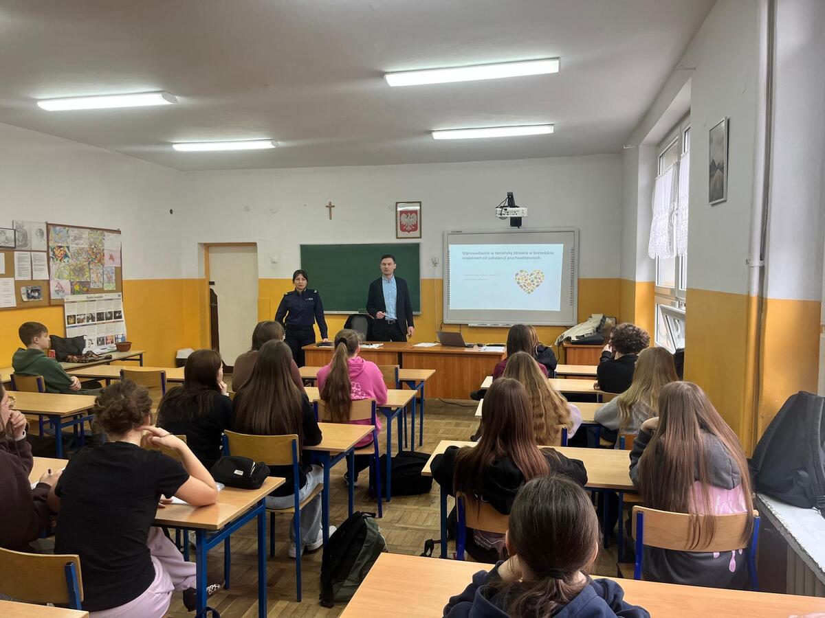 Z kolei w Niepublicznej Szkole Podstawowej w Przelewicach odbyło się spotkanie z rodzicami. Prelegenci skupili się na roli rodziny w zapobieganiu zagrożeniom, wskazując na znaczenie rozmowy, obserwacji zachowań dzieci oraz wczesnej reakcji. Omówiono także problem uzależnień oraz sposoby ich przeciwdziałania poprzez budowanie silnych relacji i wspieranie dzieci w codziennych wyzwaniach. Podczas spotkania zaprezentowana została również walizka edukacyjna, zawierająca przykłady środków odurzających oraz materiały poglądowe, które pomogły zobrazować skalę i charakter zagrożeń.